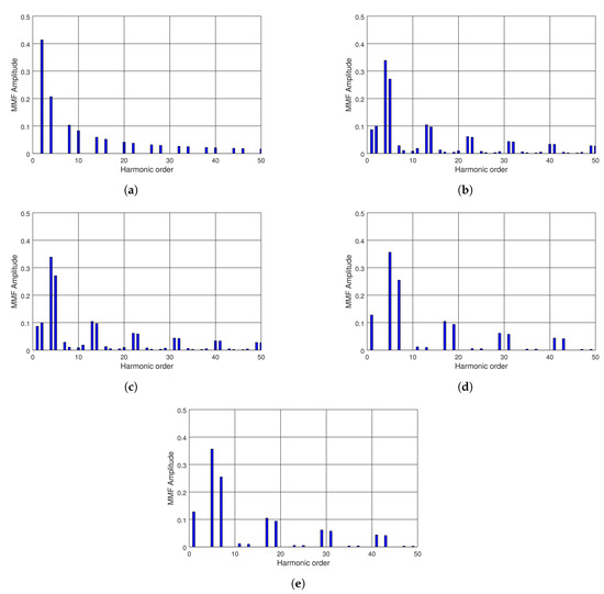 Magneto-Motive Flux (MMF) spectra for different double layer slot–pole combinations: (a) MMF of 6-4DL; (b) MMF of 9-8DL; (c) MMF of 9-10DL; (d) MMF of 12-10DL; and (e) MMF of 12-14.