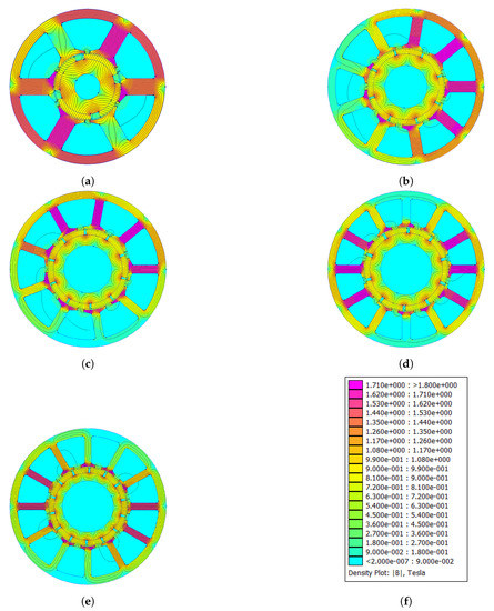 Distribution of magnetic flux density of optimized machines: (a) 6-4; (b) 9-8; (c) 9-10; (d) 12-10; and (e) 12-14.