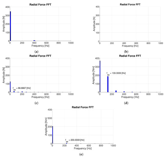 FFT of the radial forces: 9-8DL (a); 6-4DL and 12-14DL slot-pole combination without static eccentricity (b); 6-4DL (c); 9-8DL (d); 12-14DL slot-pole combinations with static eccentricity of 0.2 mm (e).