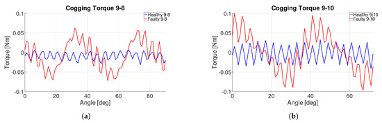 Slot–pole combinations 9-8DL and 9-10DL were the most sensitive to mechanical defects. The static eccentricity induced a rotor harmonic at Hz for 9-8DL and at Hz for 9-10DL. Hence, torque ripple and cogging torque were adversely affected by static eccentricity, as shown in Figure 5.