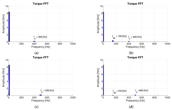 Figure 6 shows the spectra of the mean torque of 9-8DL and 9-10DL slot–pole combinations without and with dynamic eccentricity. Figure 6b,d show clearly the stator harmonic at Hz and the torque ripple harmonic Hz and Hz, respectively, which remained constant.