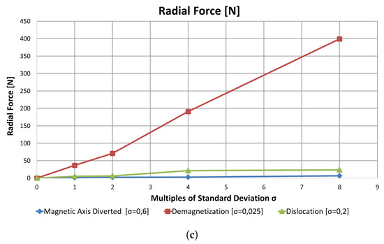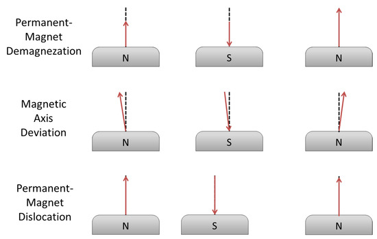Few magnetic defects were investigated: reduction of PM coercive field , i.e., demagnetization; deviation of magnetic axis; and dislocation of magnets, i.e., anomalies in the distance of magnets (see Figure 7). The single magnetic defects were applied on any magnetic pole, with a Gaussian distribution over the tolerance range.