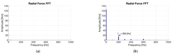 Figure 4 compares the harmonic spectra of the radial force of the 9-8DL and 12-14DL slot–pole combinations under healthy conditions and with a static eccentricity of mm, computed by FEA simulations.