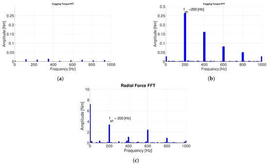 Cogging torque FFT of 12-14DL: in healthy condition (a); with magnets dislocation (b); and with radial force FFT with magnet dislocation (c).
