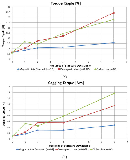 Manufacturing defects were modeled by FEA, using a Gaussian distribution of magnetic defects. The severity of magnetic fault was investigated using as parameter the standard deviation of the Gaussian distribution. Table 10 shows the initial parameters of the Gaussian distributions of magnetic defects.