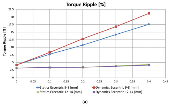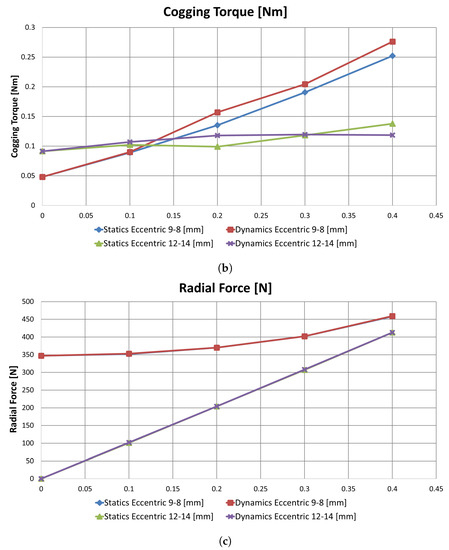 As for mechanical defects, fault severity was assessed relying on a deterministic model: eccentricity was increased by steps of mm. Here, two slot–pole combinations were used, based on results in Section 5.1: 9-8DL and 12-14DL. In terms of mean torque, 12-14DL was more sensitive to mechanical fault severity than 9-8DL (Figure 11a). In terms of cogging torque 9-8DL, was more sensitive to mechanical fault severity than 12-14DL (Figure 11b). In terms of radial force, 12-14DL was more sensitive to mechanical fault severity than 9-8DL, as already reported in Section 5.1.