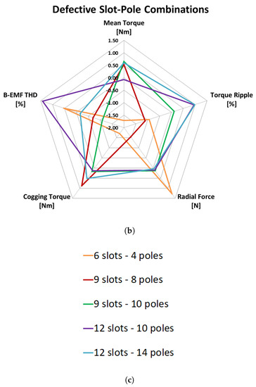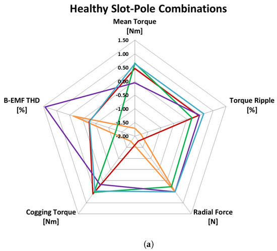 Then, the performances of healthy and faulty machines for different slot–pole combinations were compared in terms of the benchmarks in Table 1. FEA results are summarized by Kiviat diagrams, which can show more than three parameters on a 2-D plane, being the number of vertex of the polygon the number of parameters.
