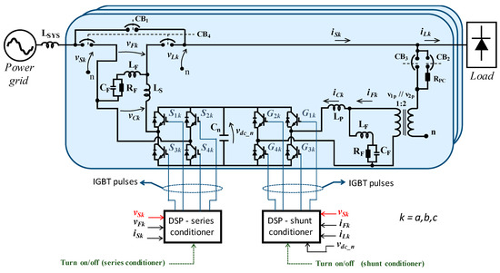 Furthermore, there are circuit breakers applied to connect the UPQC to the power grid or to remove it in case of malfunction of the power converters. As illustrated in Figure 1, the circuit breakers CB1k and CB4k are used to connect or to remove the series conditioner with the power grid, whereas CB3k and CB2k are used to connect or to remove the shunt conditioner. There is also a pre-charge resistor, RPC_k to minimize the growing rate of the DC-link voltage when the shunt conditioner is connected to the power grid for the first time. A description about the UPQC start-up procedure is presented in Section 4.