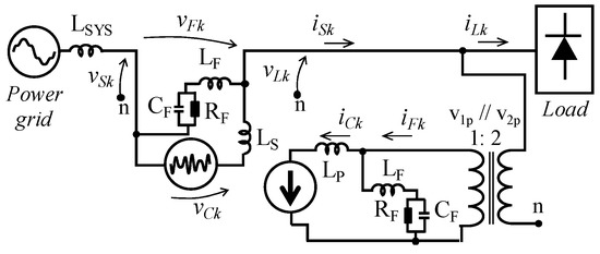 The DC-link of both conditioners is composed by three capacitors connected in parallel. All of these capacitors present a capacitance of 8200 µF and are able to support DC voltages up to 350 V. Second order RLC passive filters are applied to filter the high-frequency switching harmonics generated by the power converters. For both conditioners, these passive filters are represented as LF (0.2 mH), RF (200 Ω) and CF (4.7 µF). The inductors represented by LP and LS are equal to 0.6 mH and 0.2 mH, respectively. Besides the second order RLC passive filters, other possibility is based on LCL filters as demonstrated in [21,22]. However, this solution has as negative aspect related to the possible low-frequency resonances with the power grid impedance, which may result in system instability. Due to this condition, it is necessary to implement an algorithm capable of damping possible low-frequency resonances, improving the overall power grid stability, or use damping resistors. The transfer functions VFk(s)/VCk(s) and IFk(s)/ICk(s) were obtained considering the simplified circuit illustrated in Figure 3.