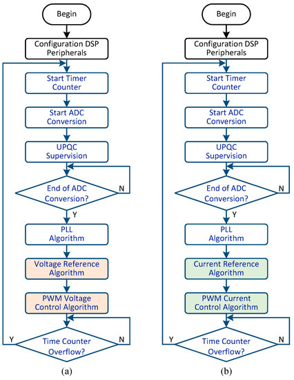 Flowcharts of the implemented algorithms: (a) In the series DSP; (b) In the shunt DSP.