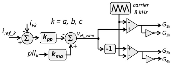 Figure 8 illustrates the PWM control of the shunt conditioner. Essentially, the voltage signal that is compared with the triangular carrier (vpk_pwm) corresponds to control signals determined by the PLL circuit (pllk), normalized by the index modulation (kma), which is the same applied at “pwm voltage control” algorithm, plus the error between the reference current, iref_k, and the current produced by the shunt conditioner, iFk. It is important to mention that the inclusion of the control signal pllk allows increasing the gain kpp, which improves the performance of this PWM controller. Considering an expansion of the applied topology with more power converter cells in a cascade multilevel topology, there is a possibility to employ other switching techniques as the ones introduced in [31,32,33]. Power converters based on multilevel converters are able to produce voltages and currents with a better resolution, at the expense of increasing the number of switches and, consequently, the complexity of the system.