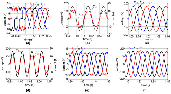 Simulation results of the load voltages (vLa, vLb, vLc) and grid currents (iSa, iSb, iSc) of the case example: (a) Grid currents (iSa, iSb, iSc) at the time transient when the shunt conditioner is turned on; (b) Grid current (iSa) and load voltage (vLa) at the time transient when the shunt conditioner is turned on; (c) Load voltages (vLa, vLb, vLc) at the time transient when the series conditioner is turned on; (d) Grid current (iSa) and load voltage (vLa) at the time transient when the series conditioner is turned on; (e) Grid currents (iSa, iSb, iSc) with the shunt conditioner under steady-state condition; (f) Load voltages (vLa, vLb, vLc) with the series conditioner under steady-state condition.