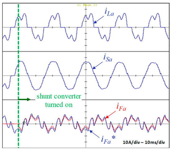 The experimental results are based on two main test cases. The first one is similar to the already introduced at the simulation results, and the second test case shows the performance of the series conditioner compensating a voltage imbalance. However, before illustrating these test cases, Figure 10 and Figure 11 show, respectively, the performance of the PWM current and voltage controllers. When the shunt conditioner is turned on (Figure 10), the produced current, iFa, tracks the reference current, iFa*, such that the compensated current, iSa, is comprised by the fundamental positive sequence of the load current, iLa, plus an active current necessary to regulate the DC-link voltage. When the shunt conditioner is operating in steady-state condition, the series conditioner is turned on (Figure 11). At this time instant, the command that kept turned on the upper IGBTs of the series conditioners is disabled. When the series converter is turned on, the voltage produced, vFa, tracks the reference voltage, vFa*, with the load voltage, vLa, corresponding to the fundamental positive-sequence of the power grid voltage, vSa.