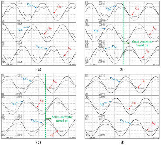 Experimental results of the load voltages (vLa, vLb, vLc) and grid currents (iSa, iSb, iSc) of the case example: (a) With both of the UPQC conditioners turned off; (b) At the transient when the shunt conditioner is turned on; (c) At the transient when the series conditioner is turned on; (d) At steady state condition. (50 V/div, 10 A/div, 5 ms/div).