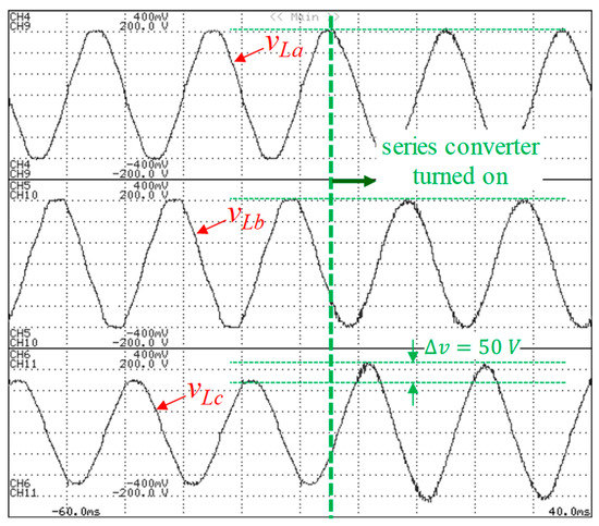 Experimental result at the transient when the series conditioner is turned on compensating imbalanced voltages (test case 2). (50 V/div, 10 ms/div).