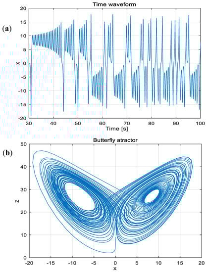 Figure 2a, and the corresponding chaotic attractor in the phase space (known as the butterfly attractor) is projected onto the