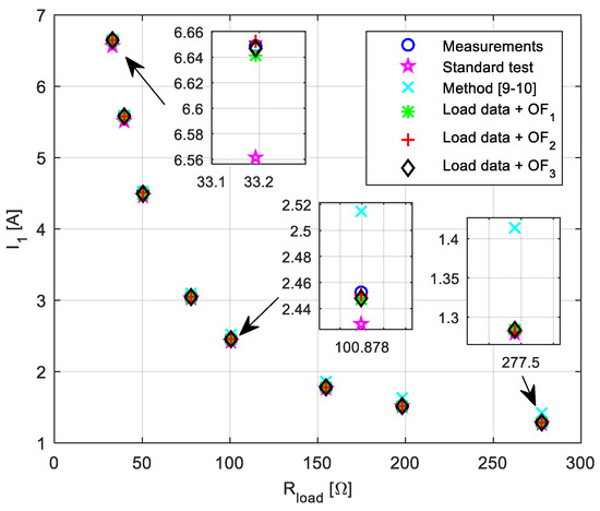 Figure 6). This is a consequence of the fact that this method is based on full load data (high value of current). However, for lower current values, there are certain deviations between the measured and estimated values.