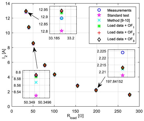 10], the authors pay attention to the difference between estimated transformer parameters and the parameters obtained by using open-circuit and short-circuit tests. The parameters obtained by using the open-circuit and short-circuit tests do not guarantee an ideal matching between the measured and estimated (by using an equivalent circuit and in that manner calculated parameters value) output characteristics (for example: secondary current–load resistance characteristic) or an ideal matching between the measured and the estimated values of the primary current, secondary current and secondary voltage at full load. The unknown parameters of the transformer equivalent circuit need to be accurately estimated for the best possible matching between the measured and the estimated transformer output characteristics for all possible load values. For that reason, the objective function for parameters estimation presented in [