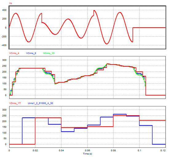 Urms(1/2) for a voltage signal (Vs) are compared. The significant differences between the two compared methods may be easily checked: the moving window method depicted in the traces is labeled as VCrms_x for four, eight, and 16 samples per half a period, respectively, and the IEC method presented in the traces is named VDrms_1T and Urms1_2_6100_4_30.