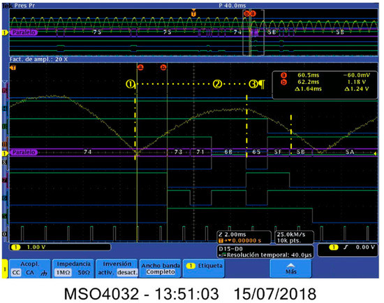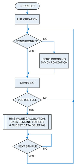 22], was built and configured with a clock frequency of 16 MHz. The selected sampling frequency was 1 kHz, i.e., a 20 samples per AC voltage signal period, and the programmed procedure fit what is described in