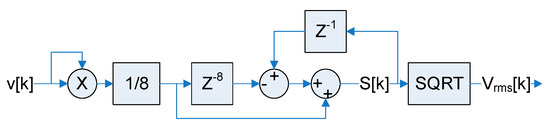 Using this method, the squared values of the sampled vector are divided by the vector length prior to the summation. Hence, by choosing an 8-data vector length, the instruction of dividing an integer by eight becomes a faster operation than the division by a non-power of two. In such a way, the 16-bit size of the data will not be overflown by the results and, therefore, will optimize their size. Thus, the discrete time function described above in