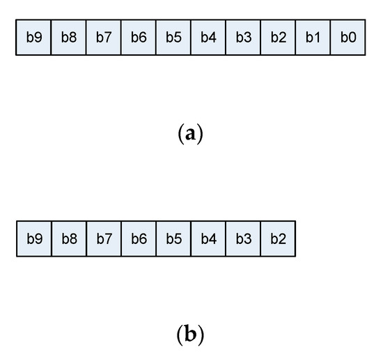 Working with powers of two values allows simplifying all the calculus to be done as well. Thus, only the eight most significant bits (MSBs) of the 10-bit data from the ADC were considered, as displayed in