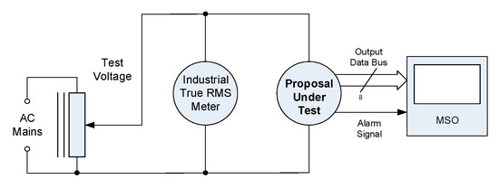 On the other hand, there were only 8 bits considered from the 10 ADC output. Thus, the ADC resolution was set to 19.6078 mV per step, i.e., each bit in the RMS value corresponded to 1.96 volts with the referred scaling factor.