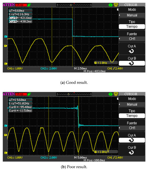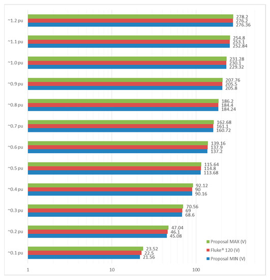 Firstly, on the one hand, for these experiments, the voltage transducer block scaling factor was established in 1:100 to fit the desired measuring range upper limit to 500 V and adapt it to the microcontroller ADC input range, which was set as up to 5 V. This upper limit was set because it is just over 150% of the supply voltage peak value, i.e.: