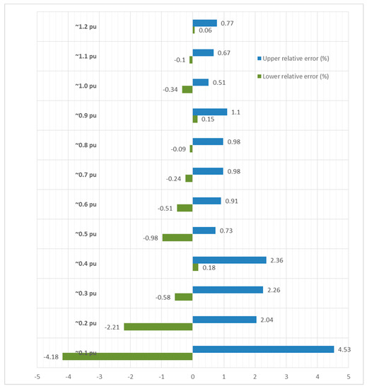 Figure 15 depicts the relative error for both the maximum and the minimum phasor module value estimations regarding the real objective value measured with the reference true-RMS digital multimeter.