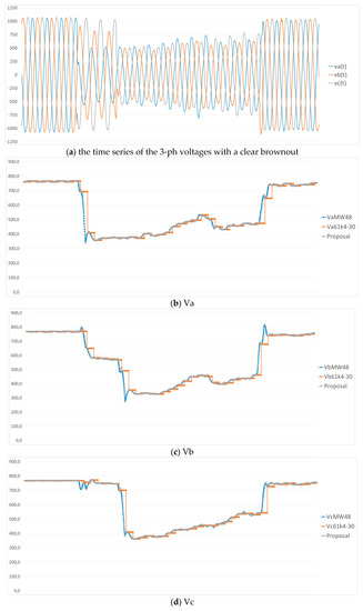 Figure 18a the time series of the 3-ph voltages with a clear brownout are shown. The measured data from a 96 sample per period double-precision data vector moving window from a DSP (digital signal processor) metering device (grey color and the legend ‘VxMW48′), lines RMS values obtained using the IEC 61000-4-30:2015 method for half a period (orange color and the legend ‘Vx61k4-30′), and the data provided by this proposal (blue color and the legend ‘Proposal’) are depicted in