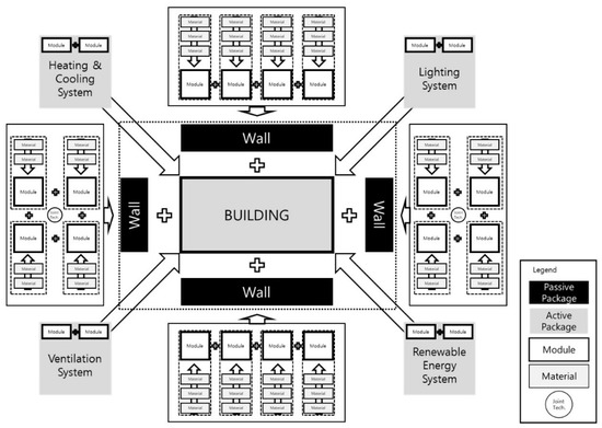 We construct a module through a combination of building materials and apply a joint technology for joining modules to construct a package. Finally, buildings can be constructed by coupling packages. Figure 2 shows the overall configuration of the passive technology package.