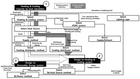 Active technology package modules can be distinguished as heating, cooling, air conditioning, ventilation, lighting, heat source of renewable energy, and power of renewable energy. Unlike the modular configuration of the passive technology package, the active technology package module can be constructed based on the building’s air conditioning equipment plan. As shown in Figure 4, it is possible to add or delete constituent facilities depending on the configuration order of modules and the nature of modules. After calculating the capacity according to the initial load calculation and choosing the cooling and heating method, the application system of renewable energy is selected according to the final setting of the cooling and heating system and the lighting method. Then, the module of the system that distributes it in order is selected.