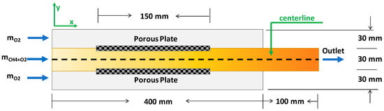The numerical solution is based on the CFD approach, in which a finite volume method was implemented to discretize the governing equations using commercial software fluent 18.0. In the simulation, a staggered grid was used [24]. The steady 2-D flow was simulated while using the double-precision solver. In the pressure–velocity, coupling the semi-implicit method was used. The second order upwind schemes were incorporated for the discretization of momentum and energy equation. The detailed setting regarding the simulation setup can be found in Reference [22]. Oxygen concentration and outlet temperatures were monitored to ensure the convergence. The domain was meshed with quadrilateral elements using gambit 2.4 software, a fine grid was made near walls, porous plates, and at the beginning and end of the porous plates where high gradients were expected. The grid independence study was carried out using the 16,000, 24,000, and 30,000 rectangular elements for meshing. Insignificant variations were observed for 24,000, and 30,000 rectangular elements. Therefore, for reducing computational efforts, 24,000 elements were used for the meshing of the geometry.