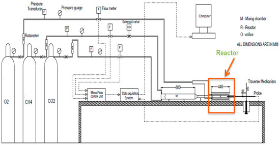 The experimental setup as shown in Figure 2 was used to measure species concentration at different locations inside the porous plate reactor under non-reacting conditions. Gaseous flow rates were varied using mass flow controllers. Three types of gases were used, i.e., N2 as fuel, O2 as oxidizer, and CO2 as carrier gas. Nitrogen (N2) was selected because of non-reactive conditions, and the molecular weight of N2 was comparable to CH4. N2 and CO2 are fed from cylinders into an 800 mm long mixing chamber to ensure homogeneous mixing. The N2/CO2 mixture then enters the reactor as shown in Figure 1. The reactor is equipped with two porous plates of 150 mm length that start from x = 125 mm and end at x = 275 mm. O2 enters from the top and bottom chambers and then passes through porous membranes and mixes with the N2/CO2 mixture. The samples were collected using a 5 mm diameter probe, which can be adjusted at a specific location inside the reactor by axial and transverse movement. The collected sample was then analyzed in a gas chromatograph. Further details of the experimental setup are available in [22]. The gathered data were compared with numerical results for CFD model verification.