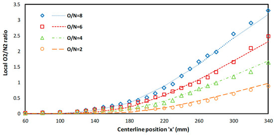 Mass weighted average velocity variation along the ‘x’ direction with different oxidizer ratios for the oxy-combustion and air-combustion case.