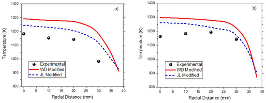 Comparison between the modified Westbrook and Dryer (WD) two-step, and Jones and Lindstedt (JL) numerical results with the experimental data by Nemitallah and Habib [25] under different oxy-combustion conditions in terms of exhaust temperature: (a) Vf = 6 L/min, O2/CO2 = 30/70, Φ = 0.65 and (b) Vf = 6 L/min, O2/CO2 = 50/50, Φ = 0.55.