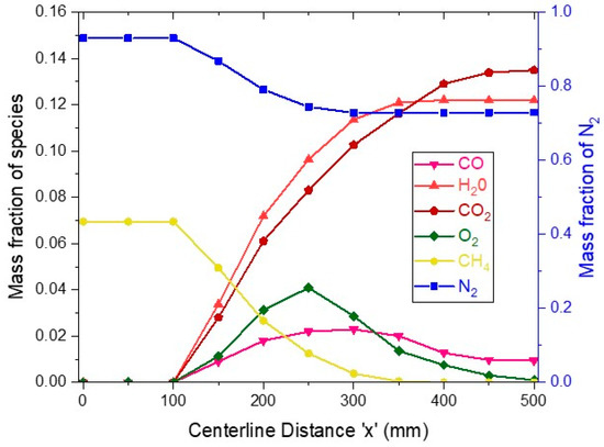 Variation of species mass fraction for air-combustion along the ‘x’ direction.