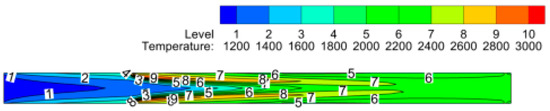 The maximum temperature in the reactor reaches 2900 K, and the outlet temperature at the exit of the reactor is 2235 K. The temperature variation inside the reactor is shown in Figure 6. The species enters the reactor at 1173 K, and the temperature of the upstream flow rises before the reaction starts, as shown by temperature level 2, i.e., 1400K; this is due to the radiative heat transfer. The region near the top and bottom porous walls has the highest temperature; this is where the combustion begins and the maximum temperature is reached. The centerline temperature is lower than the temperature near the top and bottom walls, so mass weighted average temperature variation is more accurate for study instead of centerline temperature variation.