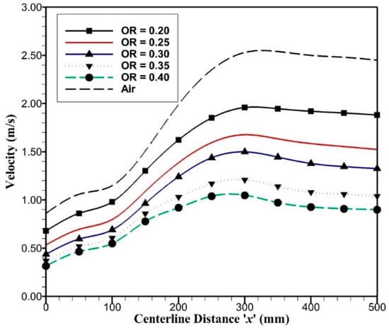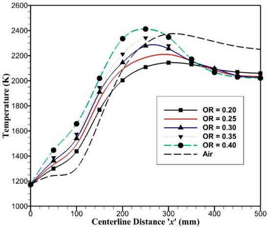 The mass weighted average temperature variation along the ‘x’ axis has been plotted for oxy-combustion with OR ranging from 0.20 to 0.40, and temperature profiles are compared with the air-combustion case, as shown in Figure 7. For oxy-combustion, temperature rises sharply as the combustion occurs at the start of porous plates, i.e., x = 125 mm, where oxygen enters the reactor. The high temperature from the combustion causes upstream temperature to rise due to radiative heat transfer. As the flow temperature reaches the maximum value, it begins to decrease with an outlet temperature in the range of 2000–2050 K due to radiative cooling. The OR = 0.40 has the maximum temperature as compared to OR = 0.20, as it contains less carrier gas, i.e., carbon dioxide. Like in oxy-combustion, in the air-combustion case, temperature rises very slowly; this is because of the different transport properties of CO2 and N2 for convective and radiative heat transfer. Since OR = 0.243 is comparable in terms of adiabatic temperature with air-combustion and is close to OR = 0.25, the reactor outlet temperatures have a significant difference of around 200 K with air-combustion. This is due to fact that air-combustion and oxy-combustion with OR = 0.25 have comparable mass flow rates, but the density of carbon dioxide is higher than nitrogen by 1.57 times that keeps a low-velocity field in oxy-combustion and high-velocity field in air-combustion as shown in Figure 8. Inlet velocity for oxy-combustion varies from 0.32 to 0.68 m/s and inlet velocity for air-combustion is around 0.86 m/s. As the oxygen permeates through porous plates, velocity rises due to added mass flow rates and outlet velocity reaches to 2.45 m/s for air-combustion and 0.9 to 1.9 m/s for oxy-combustion. Higher velocity enhances convection heat transfer and reduces radiation effects on upstream flow, which is quite evident in Figure 7; hence, it raises the outlet temperature in the air-combustion case.