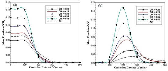 Figure 9a shows species mass fraction variation of methane for OR = 0.20–0.40 along the axial direction. As the OR is varied from 0.20 to 0.40, methane depletion rate increases due to a reduced velocity field in the reaction zone; which causes the residence time and temperature of species at certain point to increase, and combustion occurs faster. Due to this, complete methane depletion occurs at x = 225 mm for OR = 0.40 and at x = 325 mm for OR = 0.20. A higher methane depletion rate and less carrier gas result in higher maximum temperature in the reactor. For air-combustion, the methane depletion rate is lower due to the increased velocity field, and the reduced residence time in the reaction zone, methane diminishes completely at x = 375 mm, i.e., after porous plates x > 275 mm. Figure 9b shows species mass fraction variation of carbon monoxide along the axial direction. In air-combustion, carbon monoxide is produced only as the result of methane combustion; while in oxy-combustion, carbon monoxide is produced by methane combustion and from the disintegration of carbon dioxide at higher temperatures, which is present as a carrier gas. The carbon monoxide mass fraction at the outlet for air-combustion is lower. For oxy-combustion, higher oxidizer ratios lead to higher temperature at which carbon dioxide disintegrates into carbon monoxide and oxygen before the combustion starts, i.e., x < 125 mm. These factors result in peak shift for maximum carbon monoxide from x = 250 mm for OR = 0.20 to x = 200 mm for OR = 0.40. As the carbon monoxide reaches the maximum value, carbon monoxide starts to convert into carbon dioxide. Since for oxy-combustion cases with different ORs, the velocity field is low as compared to air-combustion, all of the carbon monoxide converts into carbo dioxide before the reactor outlet. The CO conversion rate is faster in higher oxidizer ratios. From these results, it is evident that convective effects need to be enhanced by raising the velocity field in the reactor for oxy-combustion cases to meet outlet temperature for the air-combustion case. This can be accomplished by either increasing flow rates or reducing the reactor height h.
