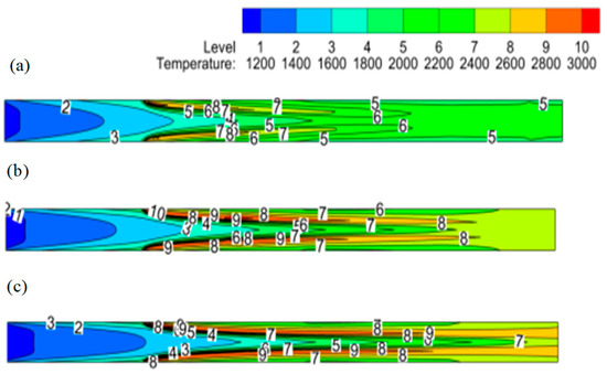 The temperature contours at inlet flow rates (1×, 2×, 3×) are shown in Figure 10. It is noticeable from these contours that mass flow rate increment causes convective heat transfer to dominate over radiative heat transfer and upstream flow becomes cooler for higher inlet flow rates as shown by blue region. The flame length also increases as the flow rates are doubled and tripled. In addition, with higher flow rates, the flame shifts towards the reactor center due to a higher oxygen influx from porous plates.