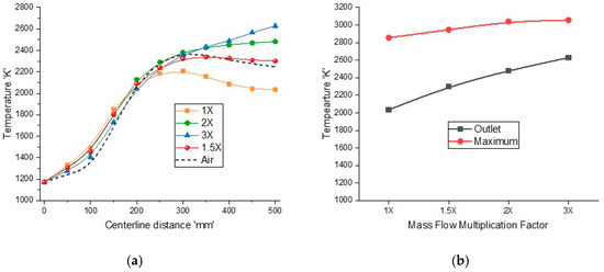 The mass weighted average temperature variations for different inlet flow rates with fixed OR = 0.25 are shown in Figure 11a. The maximum temperature in the reactor and outlet temperature for different inlet flow conditions are shown in Figure 11b. As the mass flow rate increases, the sweep flow rate increases, enhancing the velocity field and convection heat transfer, which result in higher temperatures at the reactor outlet. The outlet temperature increases from 2034 K to around 2628 K, and the maximum temperature rises from 2855 K to 3056 K when the inlet flow rates are multiplied by a factor of 3. For 1.5× flow rates, the temperature increases to a maximum value and then slightly decreases to 2301 K, which is comparable to air-combustion with 2250 K at the outlet. However, the maximum temperature for 1.5× flow rates is lower than air-combustion due to radiative cooling, which is beneficial for reactor design. For 2× flow rates, the temperature continues to rise and maintains a constant value of around 2480 K and for 3× flow rates and the temperature continues to rise until the end and does not maintain a constant value or decrease, which reflects that the reaction is not complete by the end of the reactor.