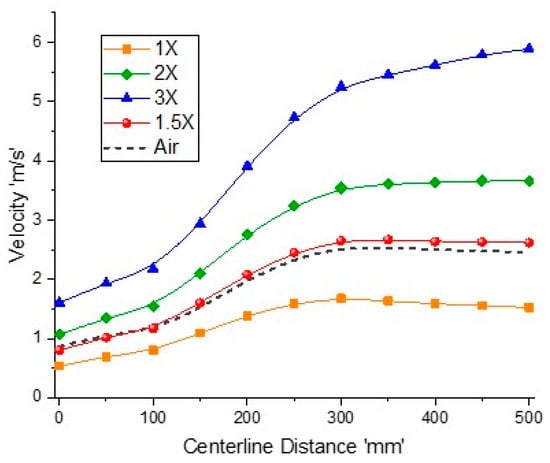 Mass weighted average velocity variation along the ‘x’ direction for different inlet flow rates with fixed OR = 0.25.