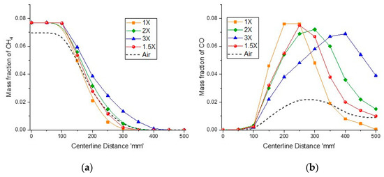 Variation of species mass fraction of (a) CH4 and (b) CO, with a different oxidizer ratio for the oxy-combustion and air-combustion case along the ‘x’ direction.