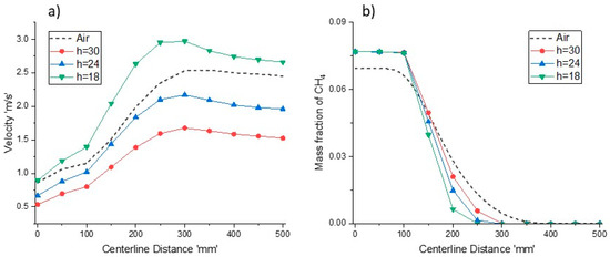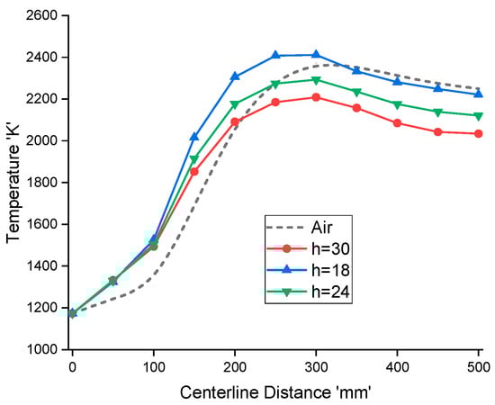 Figure 14 shows the temperature variation profiles for different reactor heights ranging from h = 30 mm to 16 mm. It can be seen that as the reactor height reduces to h = 18 mm, the outlet temperature changes from 2034 K to 2221K, which is a bit lower than that of the air-combustion case. However, the maximum temperature for h = 18 mm is much higher than that for the air-combustion. A higher temperature at a lower reactor height causes upstream temperature to rise significantly due to increased radiative heat transfer. Higher temperatures are not desirable as it limits material selection and reactor design. Figure 15a,b shows velocity and CH4 mass fraction profile for different reactor heights respectively. Decrement in reactor heights lead to increased velocities, and a further increment in the velocity profile is observed as the combustion starts. The velocity of combustion products decreases as the mixture cools near the exit of the reactor. The higher temperature profile at h = 18 mm is due to the rapid combustion, as shown by the methane conversion profile in Figure 15b. The methane depletion rates for all cases are higher than methane combustion in an O2/N2 environment. Therefore, for a comparable reactor performance to that of air-combustion, the reactor height should be reduced by 40%; however, the peak temperature is much higher than in the air case, which is not desirable.