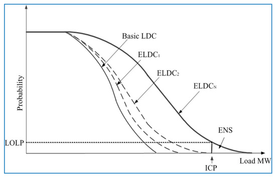 Computer models for the analysis and the planning of the power system were developed on algorithms that described certain aspects of power systems; some of them were simulations, some were optimization types, and some models were a combination of the two [12,13,14]. One of the most famous models used to calculate the LOLP through long-term planning of a power system is the Wien automatic system planning package (WASP), which is used in this analysis as well. The basis of such analysis is load duration curve (LDC) of the power system. When taking into consideration the probability of the first unit outage, the result is the equivalent load duration curve (ELDC1). The result of the outage of two first units is ELDC2, and ELDCn is the result when the probability of the outage of the last unit is taken into consideration [13,15]: