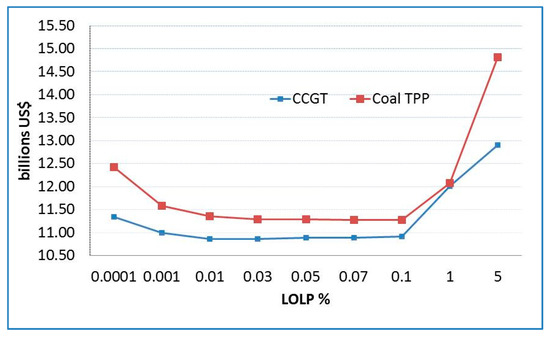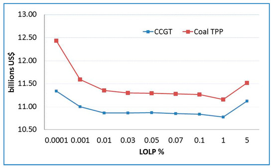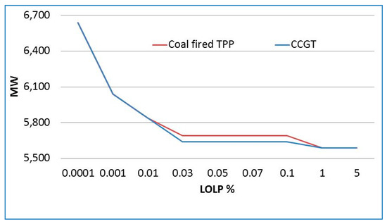 In this paper, two technologies were chosen for power plant candidates—a coal-fired thermal power plant and a natural gas-fired combined gas power plant with usual characteristics taken from literature. Analyses were conducted separately for power plant candidates, coal-fired thermal power plants (TPP), and natural gas-fired combined cycle gas turbine power plants (CCGT). The values of LOLP were simulated for this analysis ranging from 5% to 0.001%. Results are shown in Figure 2.