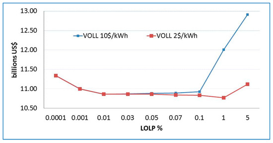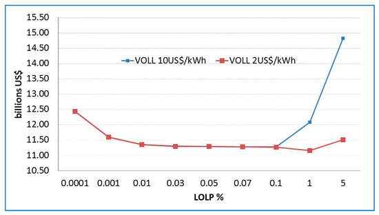 After calculating the necessary new constructions of power plants with the given value of LOLP for each LOLP limitation separately, the objective function was calculated for two levels of VOLL—$2 USD/kWh and $10 USD/kWh.