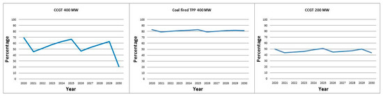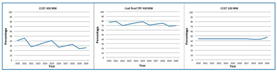 Load factors of new thermal power plants, especially the coal-fired TPP and the 200 MW CCGT, which were put into operation in the observed period, were relatively constant, whereby the load factor of the CCGT with higher capacity slightly decreased towards the end of the planned period, as seen in Figure 13.