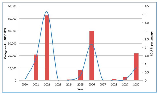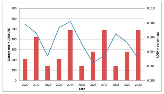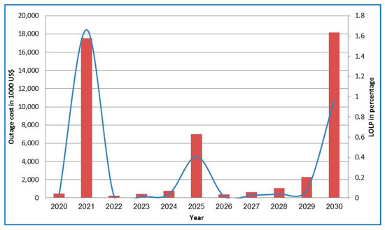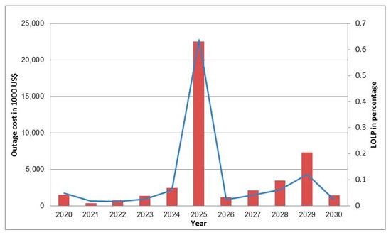 The curves in Figure 12 convey the value of LOLP and the outage cost per year, which showed characteristic behaviors. One of those was year 2022, the fourth year when no TPPs were put into operation. The maximum achieved value of LOLP was 3.95%.